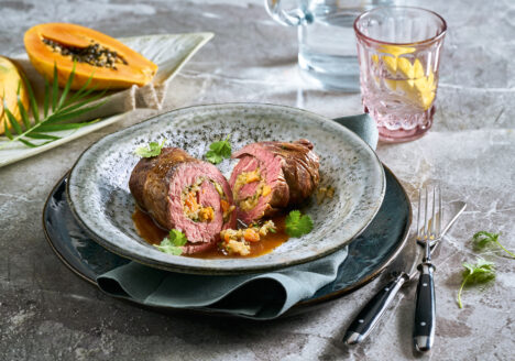Bavette vom Jungbullen als Roulade mit Reis und Papaya gefüllt