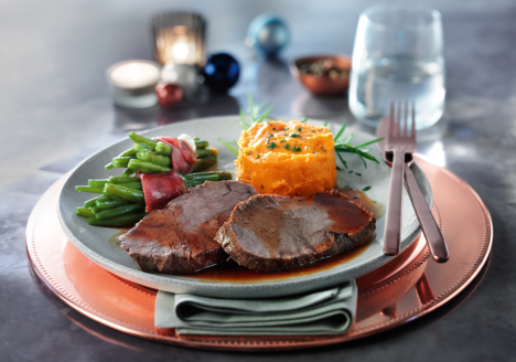 Flat Iron-Braten mit Süßkartoffelstampf und Prinzessbohnen