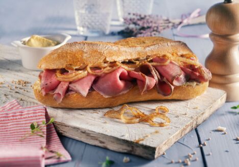Roastbeef-Sandwich mit frittierten Zwiebeln und Dijonsenf