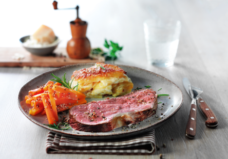 Roastbeef mit Kartoffelgratin und Sesam-Möhrchen