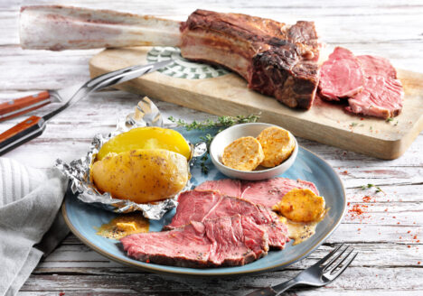 Tomahawk-Steak mit Folienkartoffeln und Chilibutter