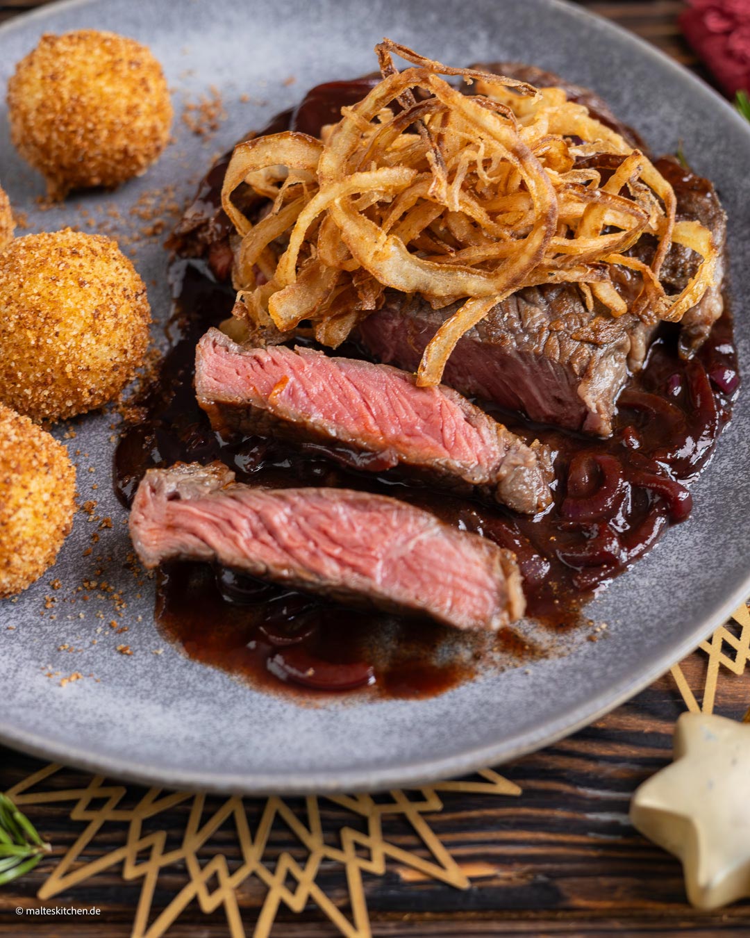 Weihnachtlicher Zwiebelrostbraten mit Klößen und Rosenkohl (von MALTESKITCHEN)